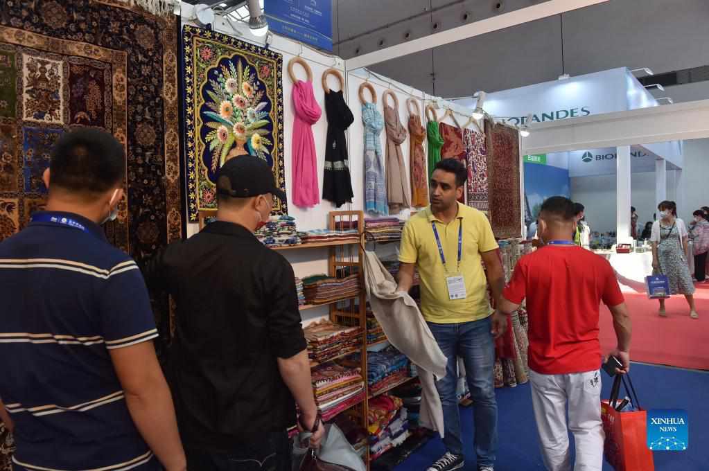 An exhibitor (2nd, R) introduces Pakistani products during the 18th China-ASEAN Expo in Nanning, capital of south China's Guangxi Zhuang Autonomous Region, Sept. 12, 2021. The 18th China-ASEAN Expo and China-ASEAN Business and Investment Summit kicked off Friday in Nanning, highlighting the building of a closer China-ASEAN community with a shared future. This year's expo continues to set "Belt and Road" International Pavilion for countries outside ASEAN, with about 120 enterprises from 30 countries participating in the expo. (Xinhua/Liu Lingyi)