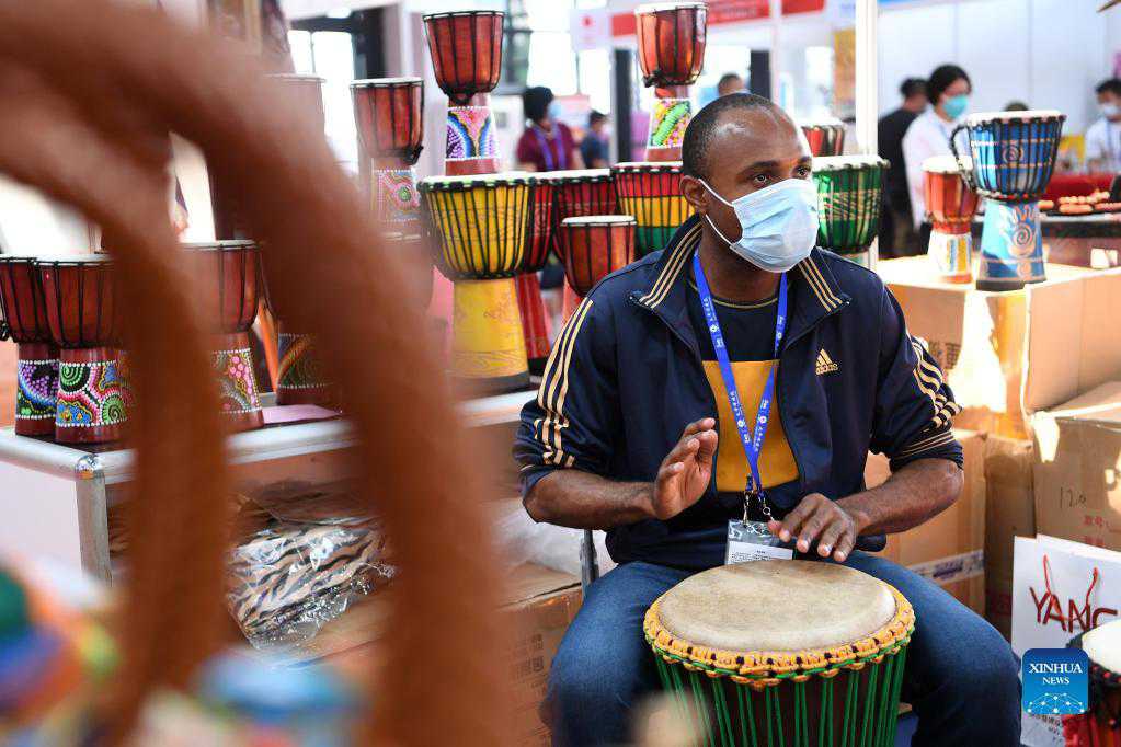 An exhibitor from Ghana plays the drum during the 18th China-ASEAN Expo in Nanning, capital of south China's Guangxi Zhuang Autonomous Region, Sept. 11, 2021. The 18th China-ASEAN Expo and China-ASEAN Business and Investment Summit kicked off Friday in Nanning, highlighting the building of a closer China-ASEAN community with a shared future. This year's expo continues to set "Belt and Road" International Pavilion for countries outside ASEAN, with about 120 enterprises from 30 countries participating in the expo. (Xinhua/Ma Ning)