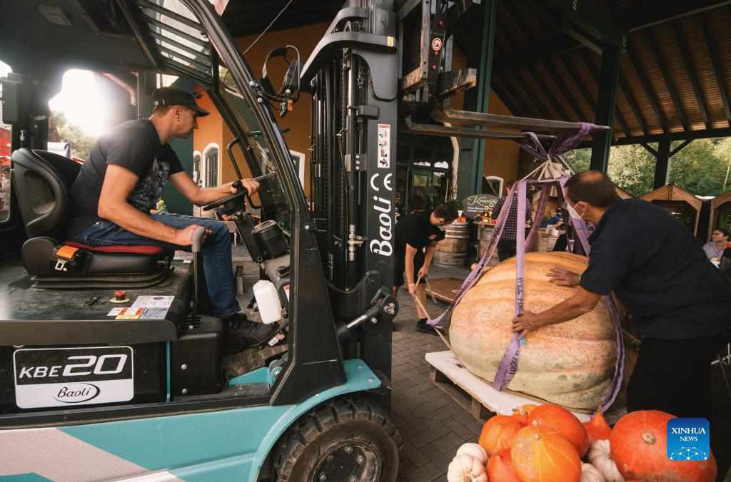 Staff members use a forklift to weigh a pumpkin during a traditional pumpkin festival in Lohmar, a town near Cologne, Germany, on Sept. 12, 2021. (Photo by Tang Ying/Xinhua)
