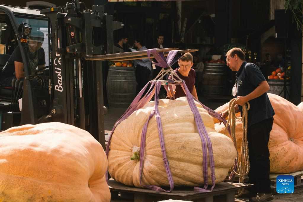 Staff members use a forklift to weigh a pumpkin during a traditional pumpkin festival in Lohmar, a town near Cologne, Germany, on Sept. 12, 2021. (Photo by Tang Ying/Xinhua)