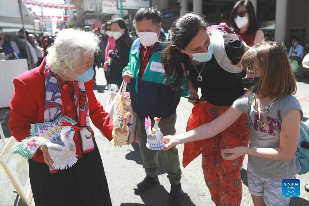 A girl (1st R) selects handicrafts during the 31st Mid-Autumn Festival fair in Chinatown in San Francisco, the United States, Sept. 11, 2021. The two-day event is held to hail the Chinese Mid-Autumn Festival, which will fall on Sept. 21 this year. The fair was closed last year because of the COVID-19 pandemic. (Photo by Liu Yilin/Xinhua)