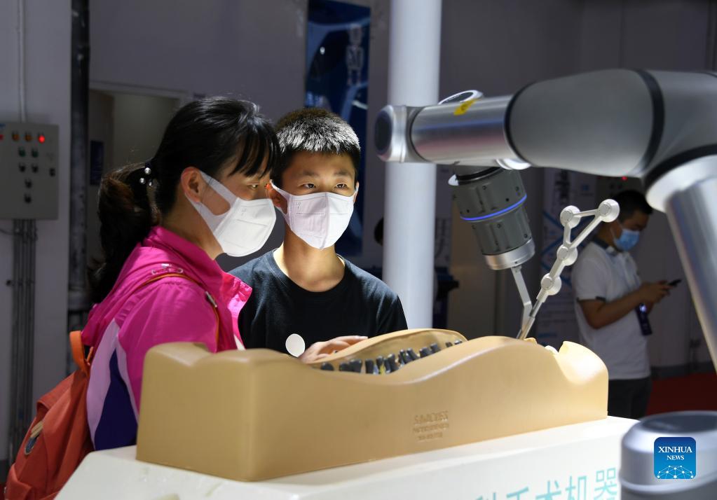 Visitors view an orthopedic surgical robot at the 2021 World Robot Expo in Beijing, capital of China, Sept. 12, 2021. The orthopedic surgical robot could dynamically analyze the patient's anatomy as well as the spine-hip relation and carry out the individualized surgery planning exactly as planned. Beijing Haidian Hospital officially introduced orthopedic surgery robots from May 2020, and has completed more than 400 robotic surgeries by the end of August 2021. (Xinhua/Ren Chao)