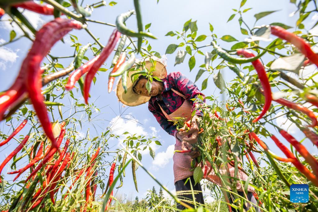 A villager harvests chili peppers in Zhaile Township of Nayong County of Bijie City, southwest China's Guizhou Province, Sept. 11, 2021. (Photo by Luo Dafu/Xinhua)