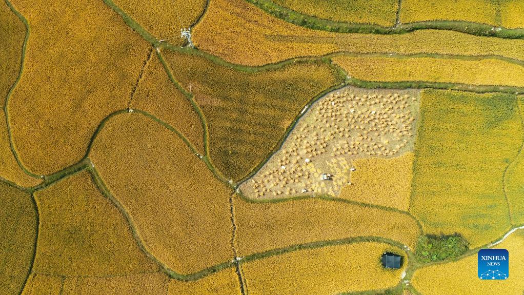 Aerial photo taken on Sept. 12, 2021 shows farmers harvesting paddy rice in Jinpi Village of Wantanhe Township in Longli County, southwest China's Guizhou Province. (Photo by Long Yi/Xinhua)