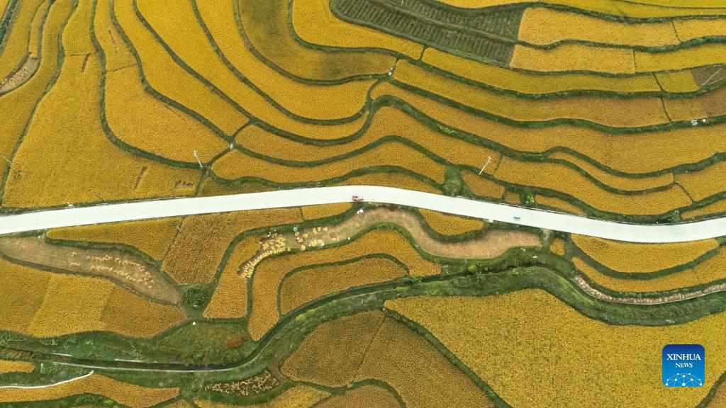 Aerial photo taken on Sept. 12, 2021 shows farmers harvesting paddy rice in Jinpi Village of Wantanhe Township in Longli County, southwest China's Guizhou Province. (Photo by Long Yi/Xinhua)