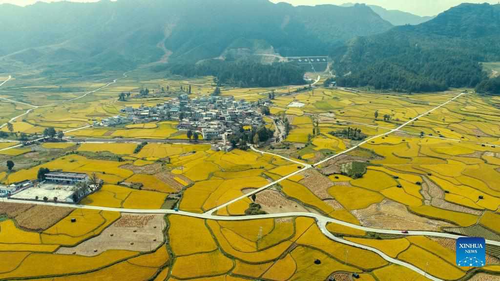 Aerial photo taken on Sept. 12, 2021 shows paddy fields in Jinpi Village of Wantanhe Township in Longli County, southwest China's Guizhou Province. (Photo by Long Yi/Xinhua)