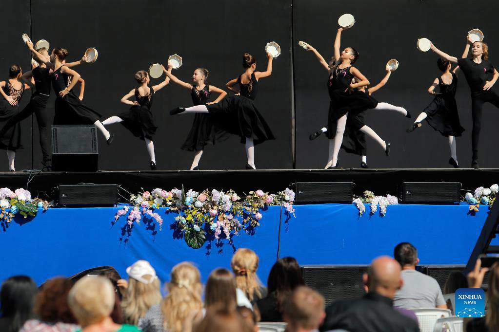 Ballet students perform on a stage in front of Bucharest's National Opera hall during the Dance Gala project - childhood in dance steps, in downtown Bucharest, Romania, Sept. 12, 2021. (Photo by Cristian Cristel/Xinhua)