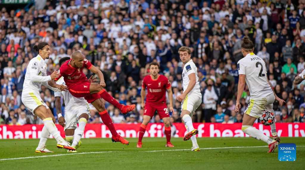 Liverpool's Fabinho (3rd L) scores during the Premier League football match between Leeds United and Liverpool in Leeds, Britain, on Sept. 12, 2021. (Xinhua)