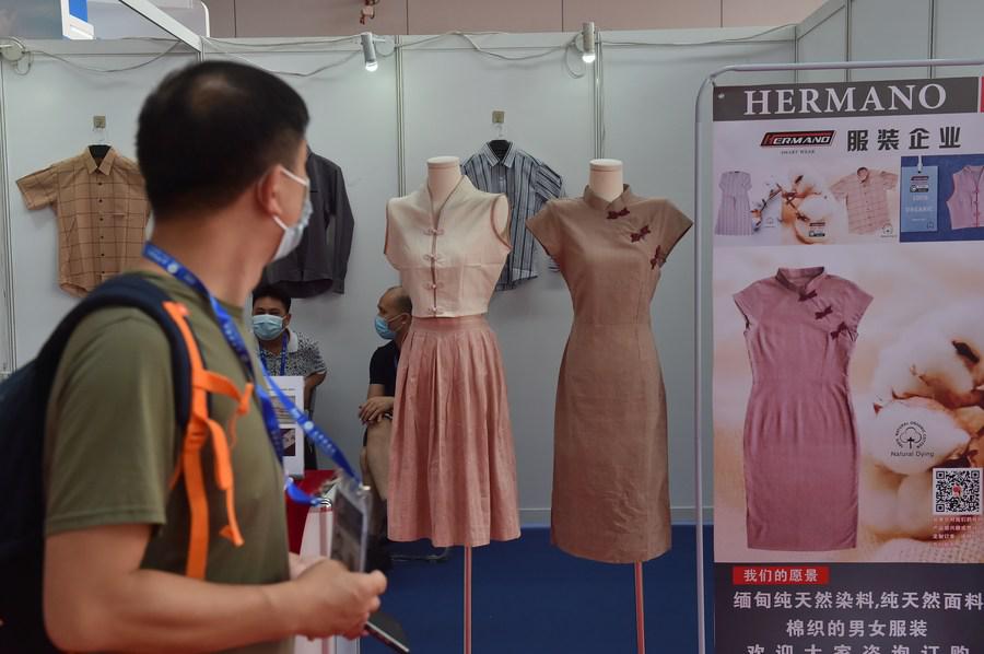 A visitor views costumes from Myanmar at the 18th China-ASEAN Expo in Nanning, capital of south China's Guangxi Zhuang Autonomous Region, Sept. 11, 2021. (Xinhua/Liu Lingyi)