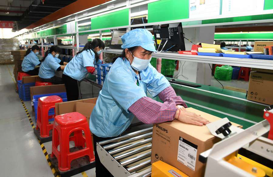 Workers make electronic products for export at a logistic zone of the China-ASEAN Free Trade Area in Pingxiang, south China's Guangxi Zhuang Autonomous Region, on April 15, 2020. (Xinhua/Lu Boan)