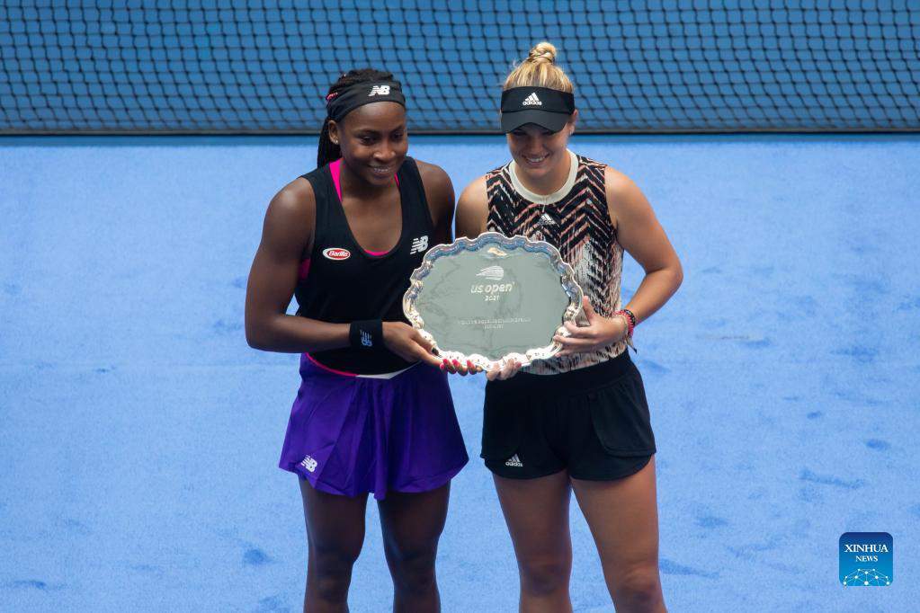 Coco Gauff (L)/Catherine McNally pose during the awarding ceremony after the women's doubles final between Zhang Shuai of China/Samantha Stosur of Australia and Coco Gauff/Catherine McNally of the United States at the 2021 US Open in New York, the United States, Sept. 12, 2021. (Photo by Michael Nagle/Xinhua)