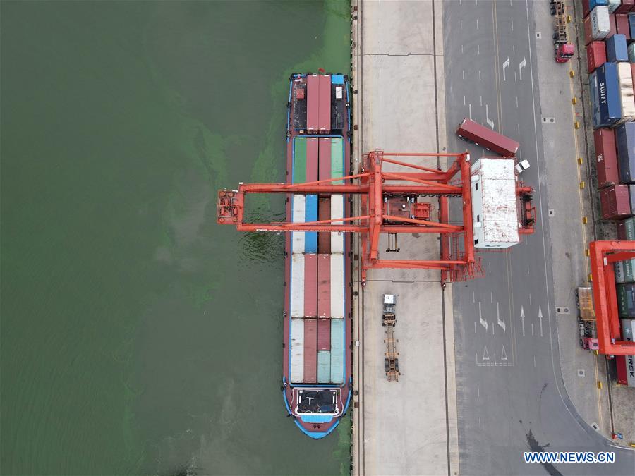Aerial photo taken on Aug 21, 2020 shows a cargo ship berthing at the International Container Terminal of Hefei Port in Hefei, East China's Anhui province. (Photo/Xinhua)