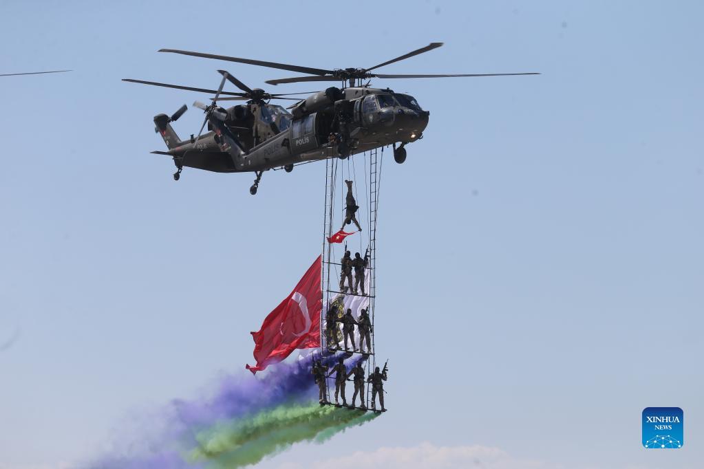 A helicopter performs during the Sivrihisar Airshow 2021 in Sivrihisar district of Eskisehir in Turkey, on Sept. 12, 2021. The Sivrihisar Airshow, which is organized annually by Sivrihisar Sportive Aviation Society, kicked off here on Sunday. (Photo by Mustafa Kaya/Xinhua)