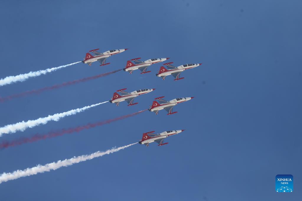 Aircraft perform during the Sivrihisar Airshow 2021 in Sivrihisar district of Eskisehir in Turkey, on Sept. 12, 2021. The Sivrihisar Airshow, which is organized annually by Sivrihisar Sportive Aviation Society, kicked off here on Sunday. (Photo by Mustafa Kaya/Xinhua)