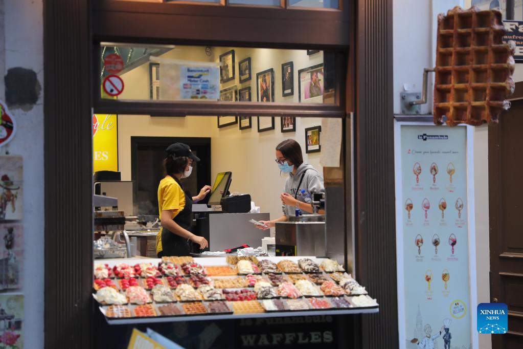 A woman buys Belgian waffle at a food shop in central Brussels, Belgium, Sept. 10, 2021. (Xinhua/Zheng Huansong)