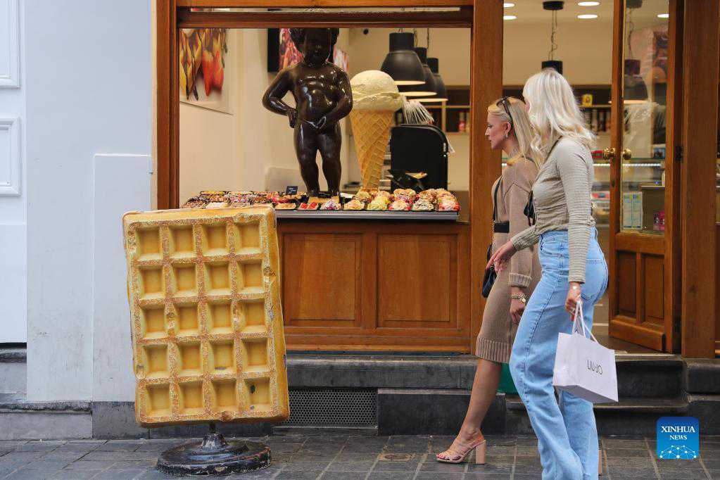 People walk past a food shop that sells Belgian waffle in central Brussels, Belgium, Sept. 10, 2021. (Xinhua/Zheng Huansong)