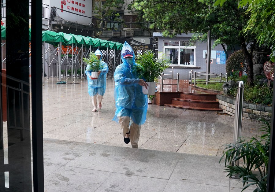 Staff members carry pot plants indoor at a primary school in Huangpu District, east China's Shanghai, Sept. 13, 2021. (Xinhua/Liu Ying)