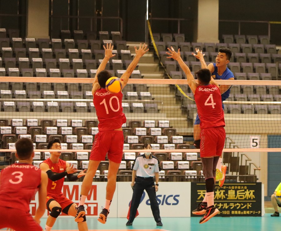 Zhang Jingyin (in blue jersey) of China spikes during their group game against Uzbekistan in the Asian men's volleyball championships in Chiba, Japan on September 13, 2021. (Xinhua/Wang Zijiang)