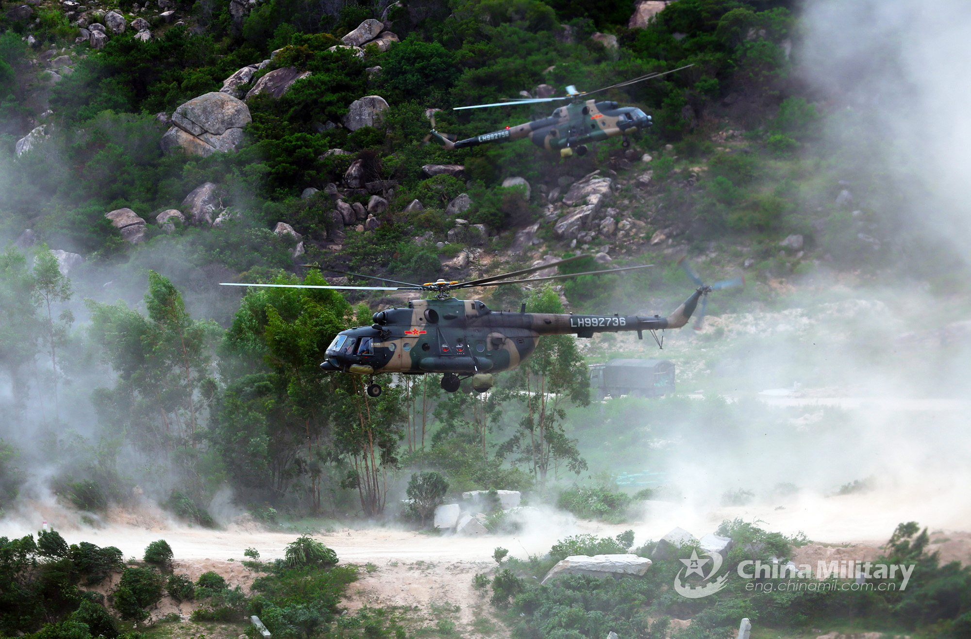 The military helicopters attached to an army aviation brigade under the PLA 72nd Group Army fly at an ultralow altitude in the valley during the defense penetration training on August 30, 2021. (eng.chinamil.com.cn/Photo by Zhang Huanpeng)