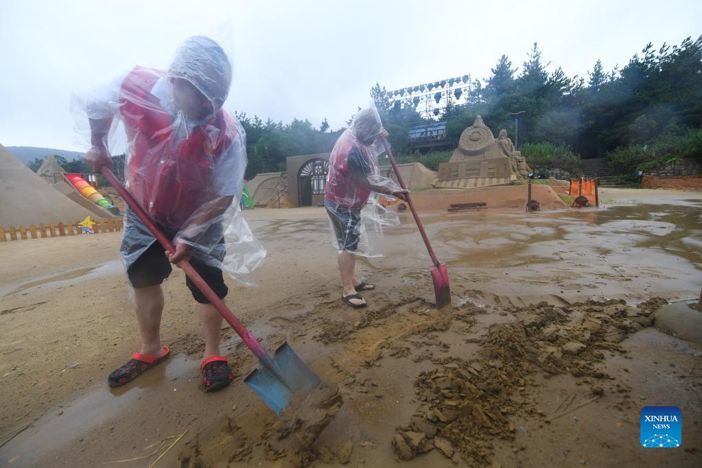 Volunteers help with drainage work at the Nansha beach resort in Zhoushan, east China's Zhejiang Province, Sept. 14, 2021. The disaster relief work is underway in Zhoushan as the influence of Typhoon Chanthu weakens. (Xinhua/Xu Yu)