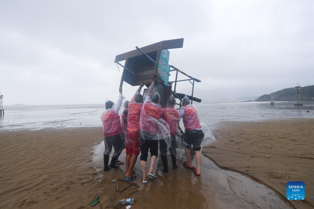 Volunteers lift up a lookout device at the Nansha beach resort in Zhoushan, east China's Zhejiang Province, Sept. 14, 2021. The disaster relief work is underway in Zhoushan as the influence of Typhoon Chanthu weakens. (Xinhua/Xu Yu)