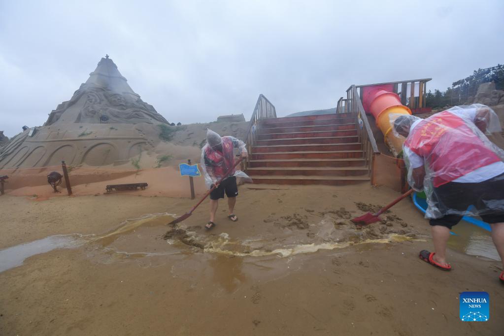 Volunteers help with drainage work at the Nansha beach resort in Zhoushan, east China's Zhejiang Province, Sept. 14, 2021. The disaster relief work is underway in Zhoushan as the influence of Typhoon Chanthu weakens. (Xinhua/Xu Yu)