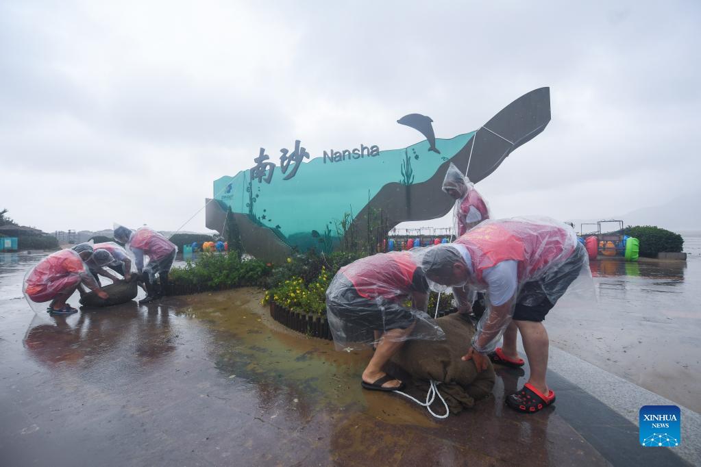 Volunteers place sandbags at the Nansha beach resort in Zhoushan, east China's Zhejiang Province, Sept. 14, 2021. The disaster relief work is underway in Zhoushan as the influence of Typhoon Chanthu weakens. (Xinhua/Xu Yu)