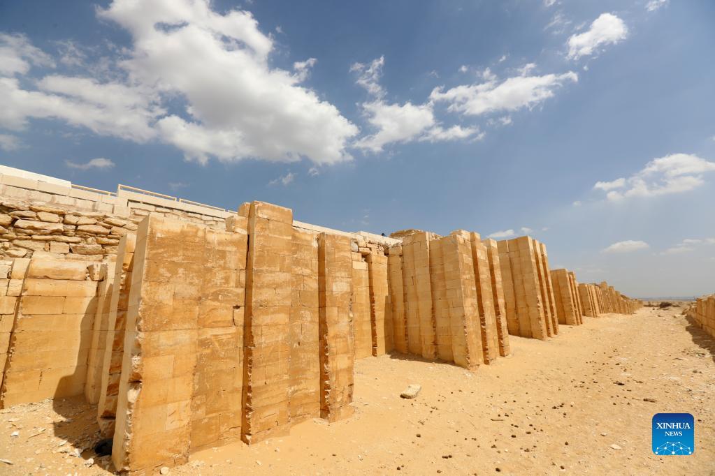 Photo shows stone buildings on the upper level of the south tomb of King Djoser in Saqqara necropolis, south of Cairo, Egypt, on Sept. 14, 2021. Egypt on Monday opened the south tomb of King Djoser after restoration in Saqqara necropolis near the capital Cairo. The restoration process started in 2006 and involved conservation and restoration work of the lower corridors, strengthening the walls and ceilings, complete the interior inscriptions in the tomb as reassembling the granite sarcophagus. (Xinhua/Sui Xiankai)