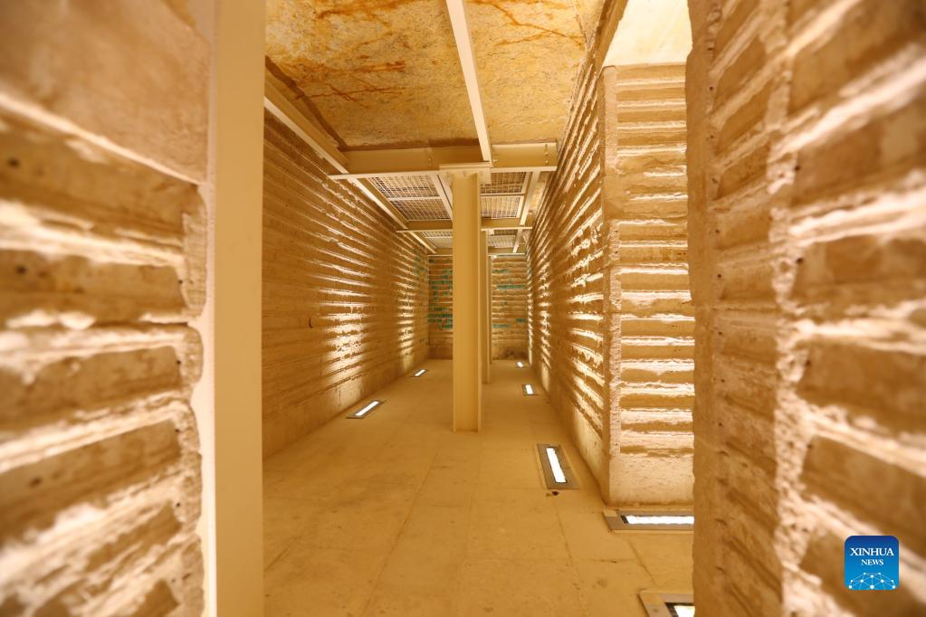 Photo shows the interior of the south tomb of King Djoser in Saqqara necropolis, south of Cairo, Egypt, on Sept. 14, 2021. Egypt on Monday opened the south tomb of King Djoser after restoration in Saqqara necropolis near the capital Cairo. The restoration process started in 2006 and involved conservation and restoration work of the lower corridors, strengthening the walls and ceilings, complete the interior inscriptions in the tomb as reassembling the granite sarcophagus. (Xinhua/Sui Xiankai)