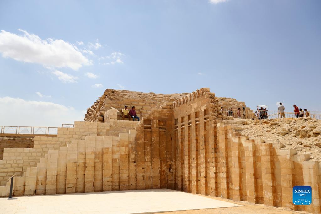 Photo shows stone buildings on the upper level of the south tomb of King Djoser in Saqqara necropolis, south of Cairo, Egypt, on Sept. 14, 2021. Egypt on Monday opened the south tomb of King Djoser after restoration in Saqqara necropolis near the capital Cairo. The restoration process started in 2006 and involved conservation and restoration work of the lower corridors, strengthening the walls and ceilings, complete the interior inscriptions in the tomb as reassembling the granite sarcophagus. (Xinhua/Sui Xiankai)