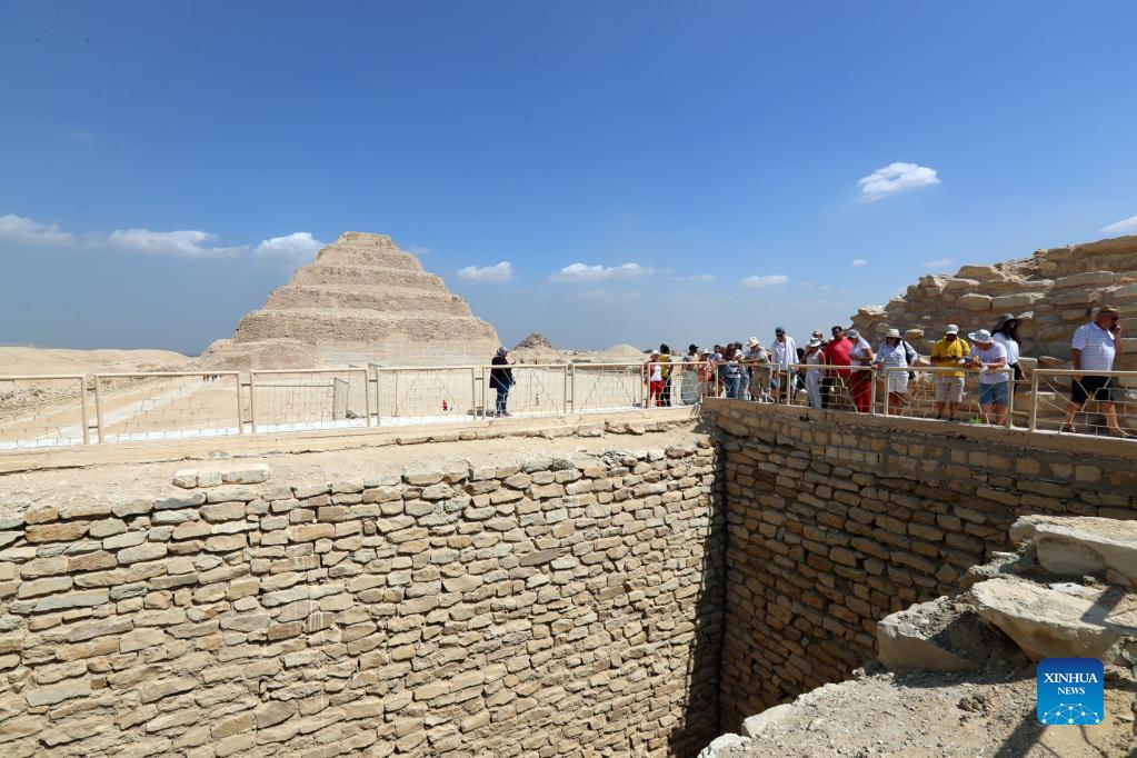 Tourists visit the upper level of the south tomb of King Djoser in Saqqara necropolis, south of Cairo, Egypt, on Sept. 14, 2021. Egypt on Monday opened the south tomb of King Djoser after restoration in Saqqara necropolis near the capital Cairo. The restoration process started in 2006 and involved conservation and restoration work of the lower corridors, strengthening the walls and ceilings, complete the interior inscriptions in the tomb as reassembling the granite sarcophagus. (Xinhua/Sui Xiankai)