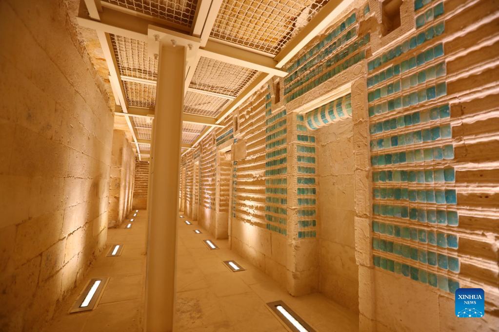 Photo shows the interior of the south tomb of King Djoser in Saqqara necropolis, south of Cairo, Egypt, on Sept. 14, 2021. Egypt on Monday opened the south tomb of King Djoser after restoration in Saqqara necropolis near the capital Cairo. The restoration process started in 2006 and involved conservation and restoration work of the lower corridors, strengthening the walls and ceilings, complete the interior inscriptions in the tomb as reassembling the granite sarcophagus. (Xinhua/Sui Xiankai)