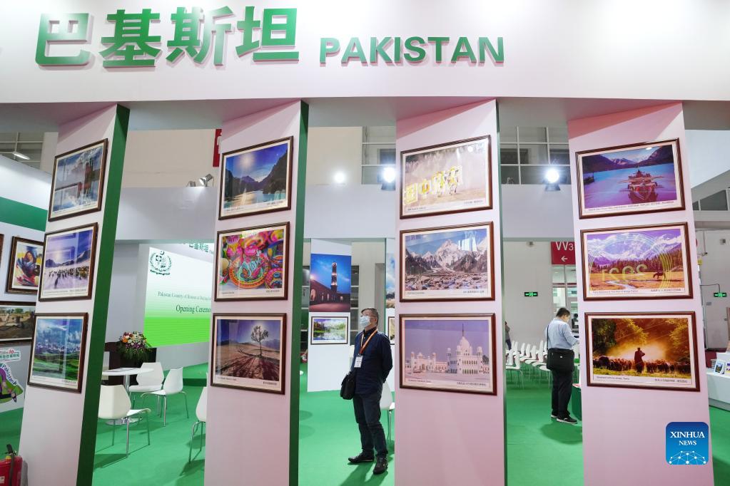 People visit the booth of Pakistan during the 28th Beijing International Book Fair in Beijing, capital of China, Sept. 14, 2021. The book fair kicked off Tuesday and is scheduled until Sept. 18. It has attracted roughly 2,200 exhibitors from 105 countries and regions, including 57 along the Belt and Road, said the organizer, adding that over 300,000 books are on display. (Xinhua/Ju Huanzong)