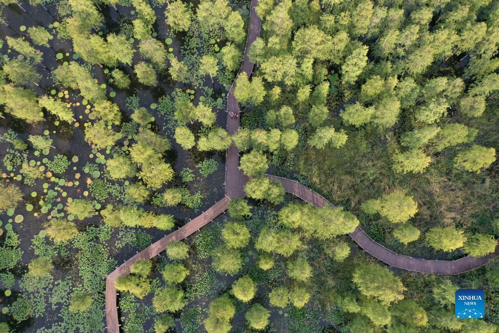 Aerial photo taken on Sept. 14, 2021 shows a view of the Chishan Lake National Wetland Park in Chuzhou, east China's Anhui Province. After years of ecological restoration, the Chishan Lake National Wetland Park has become a paradise of birds and fowls. (Xinhua/Cao Li)