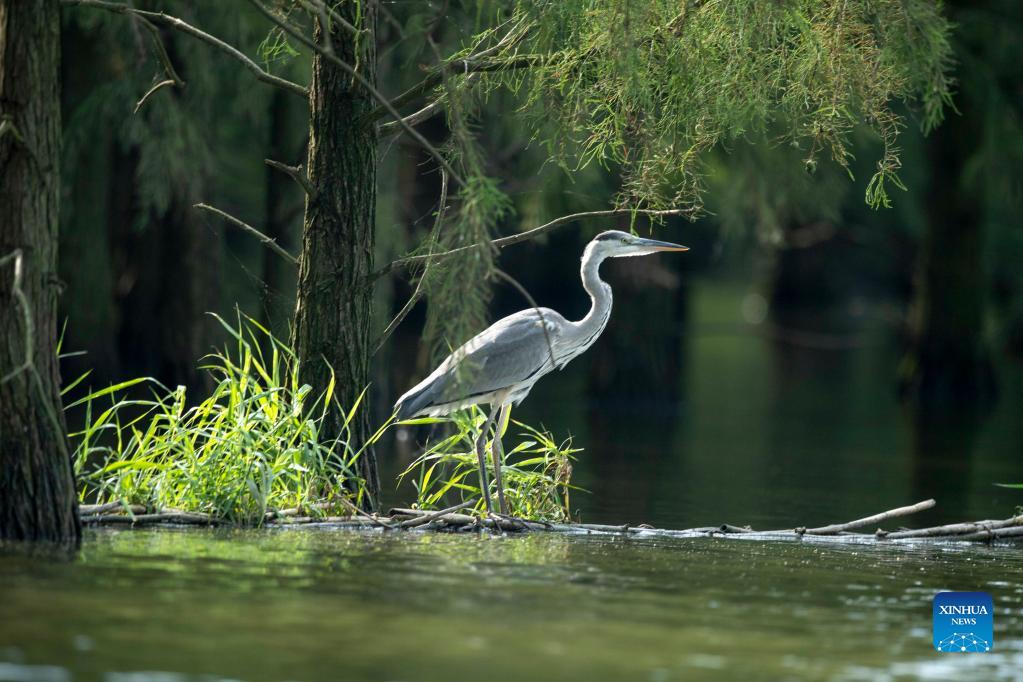 A bird rests at the Chishan Lake National Wetland Park in Chuzhou, east China's Anhui Province, Sept. 14, 2021. After years of ecological restoration, the Chishan Lake National Wetland Park has become a paradise of birds and fowls. (Xinhua/Cao Li)