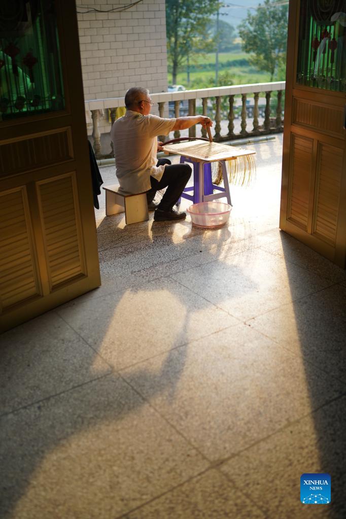 Li Nian'gen makes bamboo-weaving products in Dongcun Township, Fenyi County, Xinyu City of east China's Jiangxi Province, Sept. 1, 2021. Li Nian'gen, 62, is the fifth-generation inheritor of bamboo-weaving techniques in Dongcun Township. Li acquired bamboo-weaving techniques from his uncle when he was barely nine years old, and started to make a living on his own at the age of 15. More than 20 of his apprentices chose to seek employment for better income in other walks of life away from home in early 1990s, but Li decided to stay and stick to his profession. Li occasionally demonstrated his bamboo-weaving techniques on a video clip platform as suggested by others in 2019, and became increasingly popular ever since then. Now Li has more than 8 million followers on different platforms, with his short videos popular among netizens. (Xinhua/Zhou Mi)