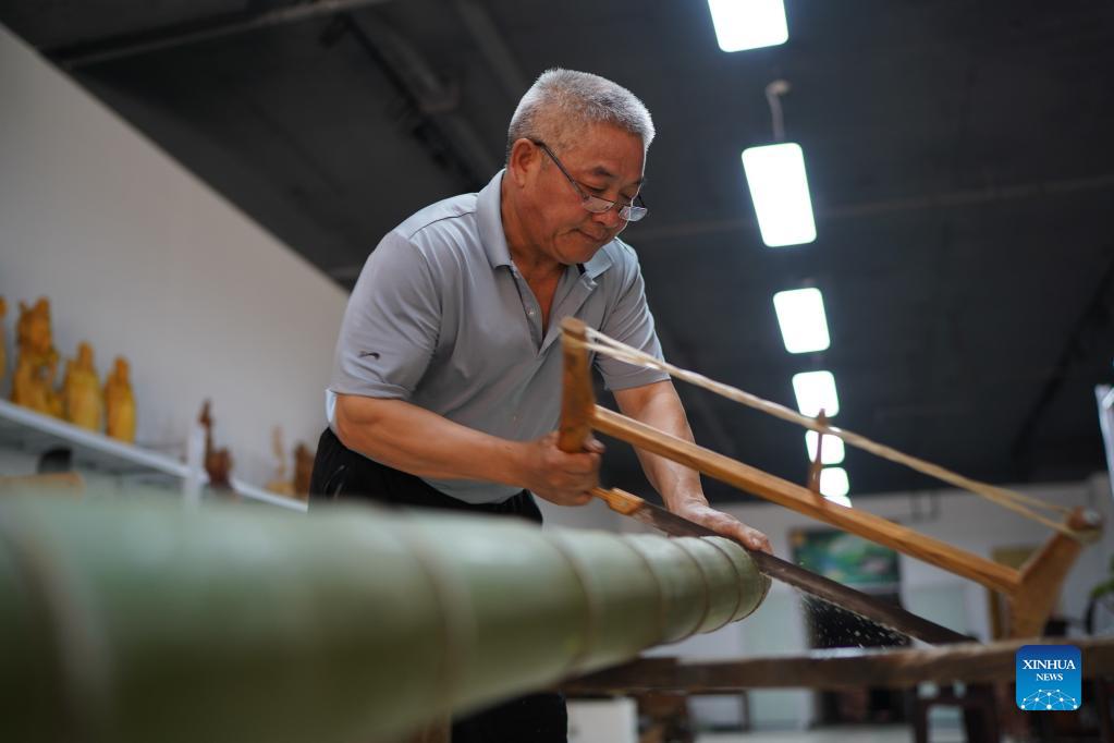 Li Nian'gen prepares raw material for his bamboo products in Dongcun Township, Fenyi County, Xinyu City of east China's Jiangxi Province, Sept. 2, 2021. Li Nian'gen, 62, is the fifth-generation inheritor of bamboo-weaving techniques in Dongcun Township. Li acquired bamboo-weaving techniques from his uncle when he was barely nine years old, and started to make a living on his own at the age of 15. More than 20 of his apprentices chose to seek employment for better income in other walks of life away from home in early 1990s, but Li decided to stay and stick to his profession. Li occasionally demonstrated his bamboo-weaving techniques on a video clip platform as suggested by others in 2019, and became increasingly popular ever since then. Now Li has more than 8 million followers on different platforms, with his short videos popular among netizens. (Xinhua/Zhou Mi)