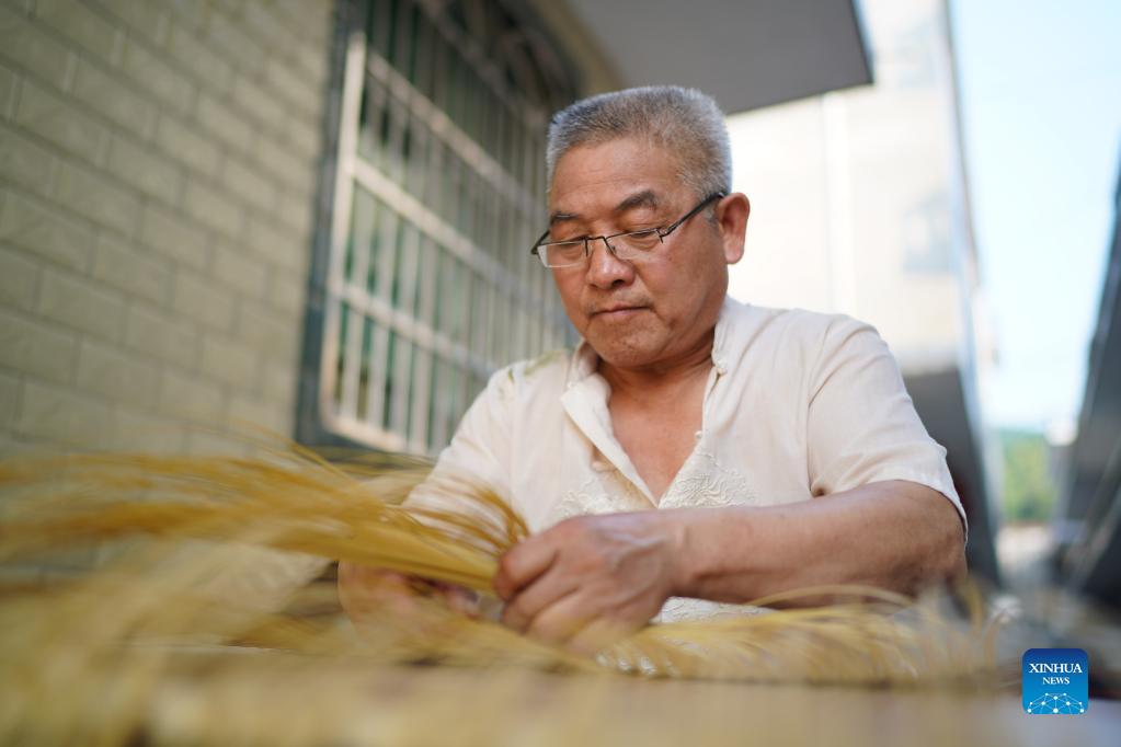 Li Nian'gen makes bamboo-weaving products in Dongcun Township, Fenyi County, Xinyu City of east China's Jiangxi Province, Sept. 1, 2021. Li Nian'gen, 62, is the fifth-generation inheritor of bamboo-weaving techniques in Dongcun Township. Li acquired bamboo-weaving techniques from his uncle when he was barely nine years old, and started to make a living on his own at the age of 15. More than 20 of his apprentices chose to seek employment for better income in other walks of life away from home in early 1990s, but Li decided to stay and stick to his profession. Li occasionally demonstrated his bamboo-weaving techniques on a video clip platform as suggested by others in 2019, and became increasingly popular ever since then. Now Li has more than 8 million followers on different platforms, with his short videos popular among netizens. (Xinhua/Zhou Mi)