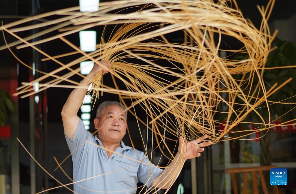 Li Nian'gen makes bamboo-weaving products in Dongcun Township, Fenyi County, Xinyu City of east China's Jiangxi Province, Sept. 2, 2021. Li Nian'gen, 62, is the fifth-generation inheritor of bamboo-weaving techniques in Dongcun Township. Li acquired bamboo-weaving techniques from his uncle when he was barely nine years old, and started to make a living on his own at the age of 15. More than 20 of his apprentices chose to seek employment for better income in other walks of life away from home in early 1990s, but Li decided to stay and stick to his profession. Li occasionally demonstrated his bamboo-weaving techniques on a video clip platform as suggested by others in 2019, and became increasingly popular ever since then. Now Li has more than 8 million followers on different platforms, with his short videos popular among netizens. (Xinhua/Zhou Mi)