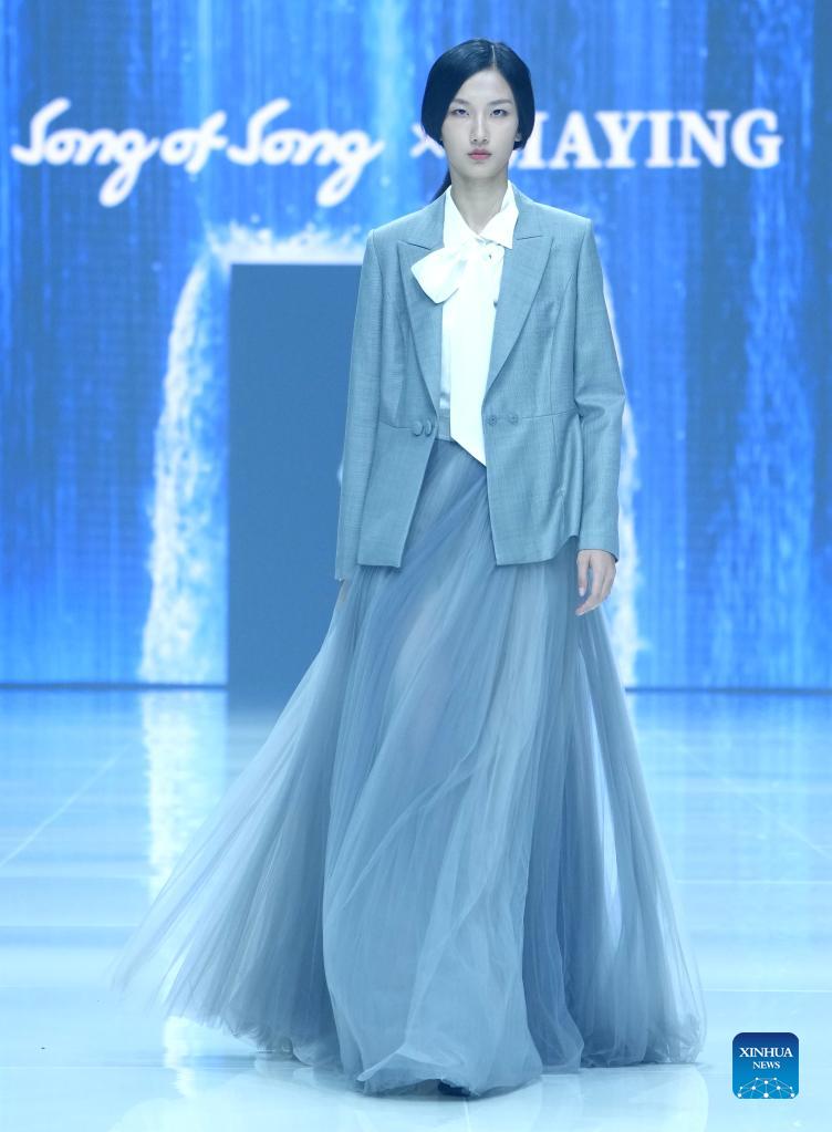 A model presents creations by designer Ma Ying at the closing show of the China Fashion Week in Beijing, capital of China, Sept. 13, 2021. (Xinhua/Chen Jianli)