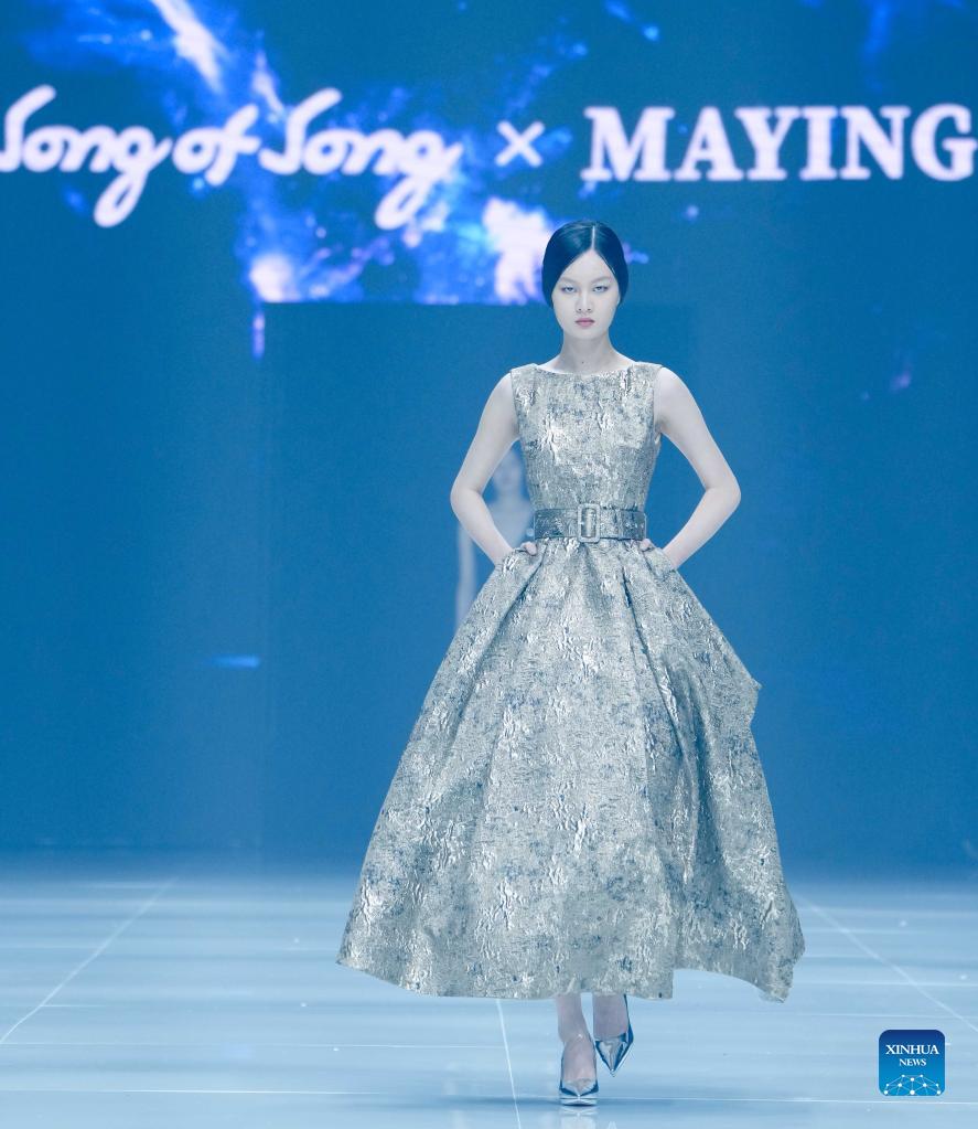 A model presents creations by designer Ma Ying at the closing show of the China Fashion Week in Beijing, capital of China, Sept. 13, 2021. (Xinhua/Chen Jianli)