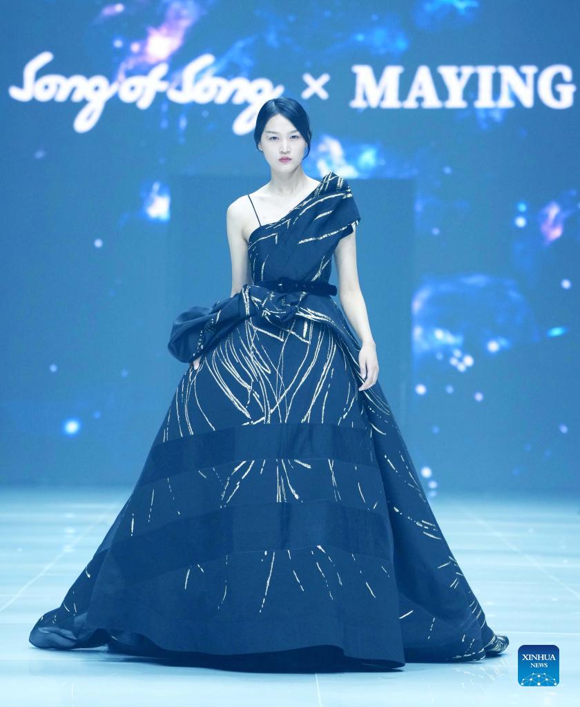 A model presents creations by designer Ma Ying at the closing show of the China Fashion Week in Beijing, capital of China, Sept. 13, 2021. (Xinhua/Chen Jianli)