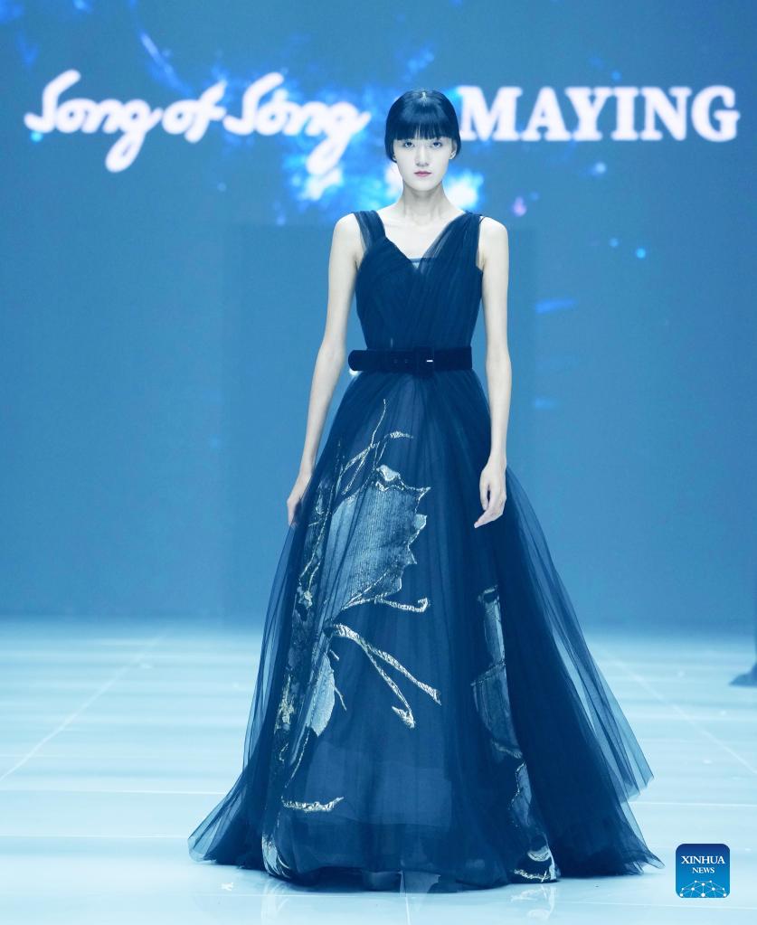 A model presents creations by designer Ma Ying at the closing show of the China Fashion Week in Beijing, capital of China, Sept. 13, 2021. (Xinhua/Chen Jianli)