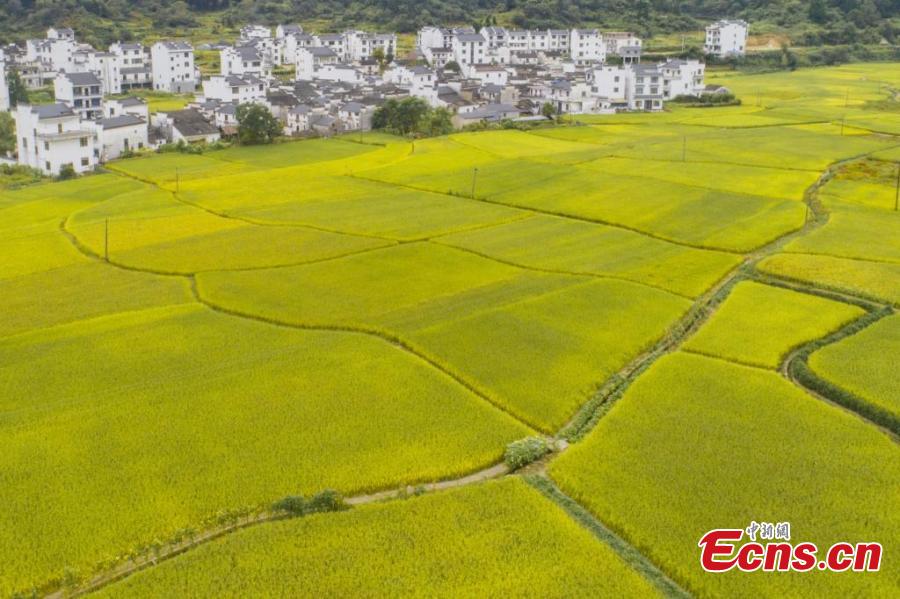 Photo taken in September 2021 shows layers of golden rice paddy and black-and-white Hui-style architecture in the fields create a beautiful harvest scene in Wuyuan, East China's Jiangxi Province. (Photo: China News Service/Zhan Donghua)