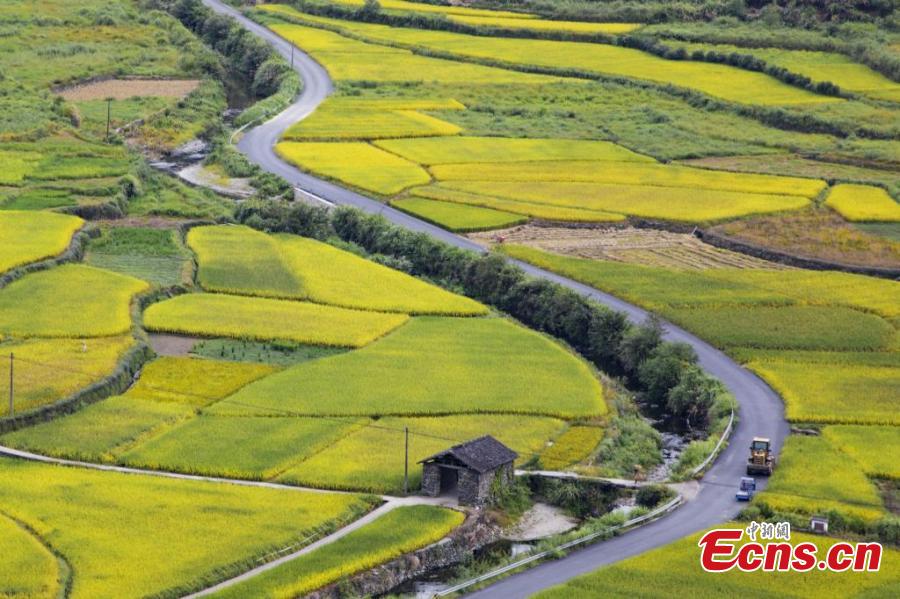 Photo taken in September 2021 shows layers of golden rice paddy and black-and-white Hui-style architecture in the fields create a beautiful harvest scene in Wuyuan, East China's Jiangxi Province. (Photo: China News Service/Zhan Donghua)