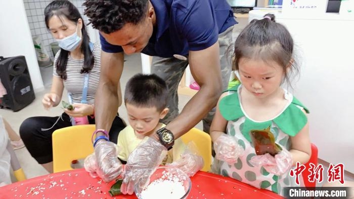 Wang Dawei tries to make a rice dumpling at his Chinese friend's home. (Photo courtesy of the interviewee)