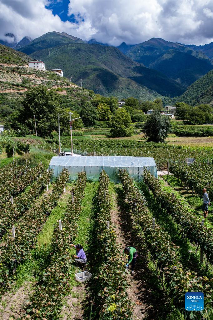 People harvest grapes in Deqin County, southwest China's Yunnan Province, Sept. 14, 2021. The grape industry has helped promote the rural development and increase the incomes of the locals. (Xinhua/Hu Chao)