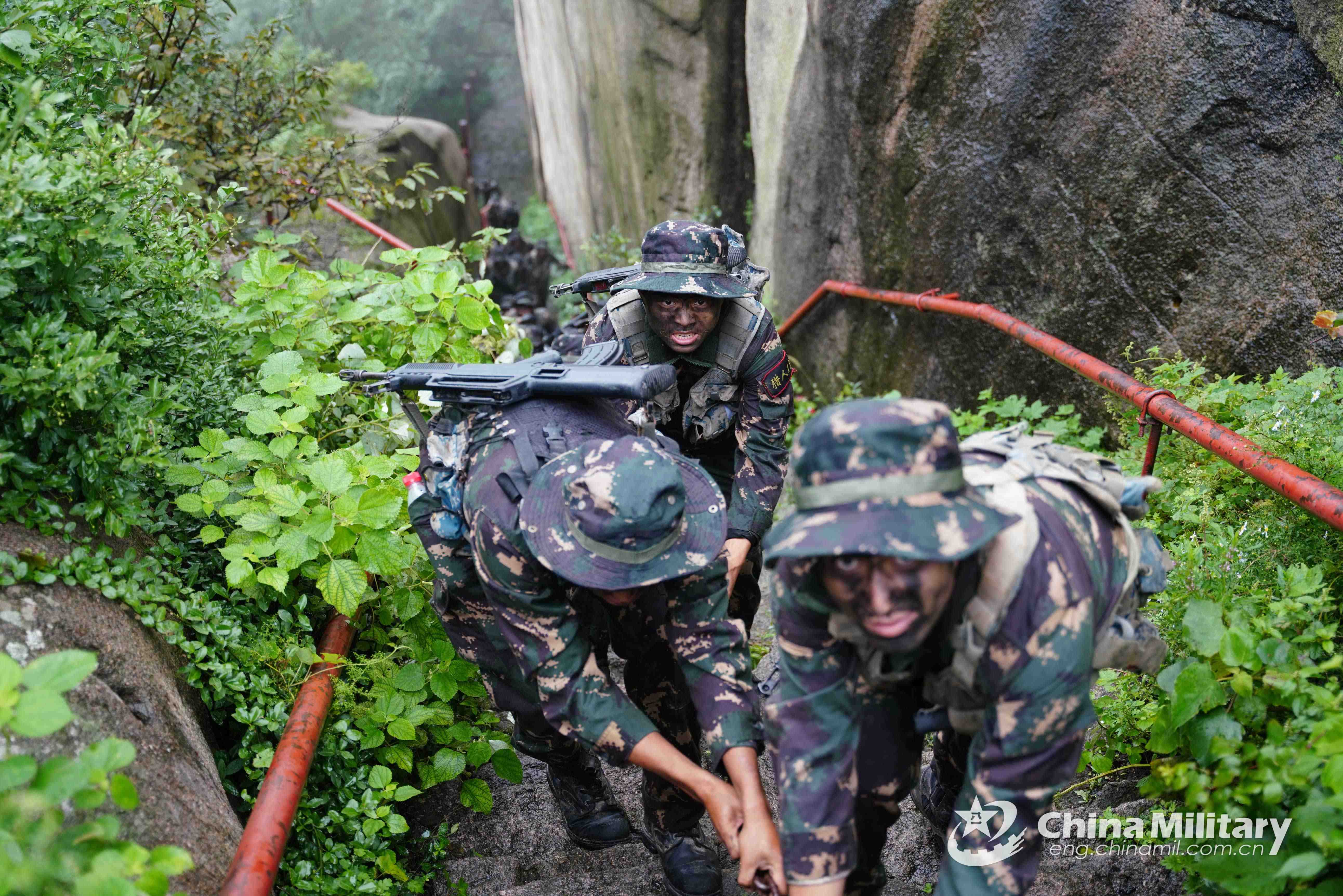 Special operations members assigned to the PLA Air Force climb the mountain in full speed during the Hell Week extreme military training in late August. Within the week-long training courses, all the 75 participating members were required to complete 25 training subjects, including loaded march and surviving in the wild. (eng.chinamil.com.cn/Photo by Yang Haofeng)