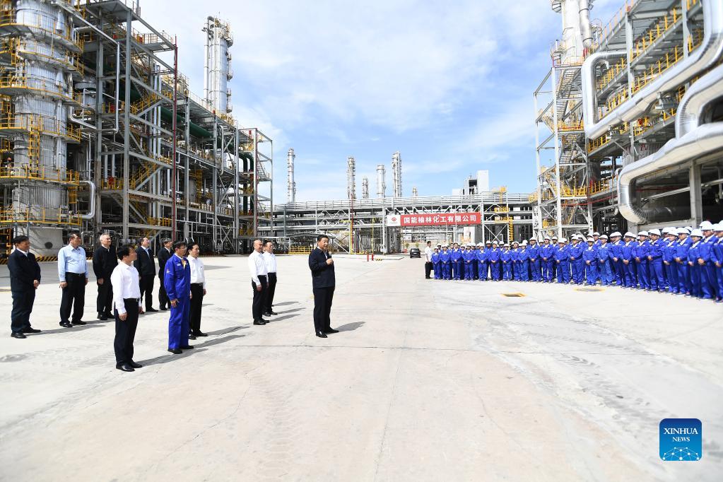 Chinese President Xi Jinping, also general secretary of the Communist Party of China Central Committee and chairman of the Central Military Commission, talks to the employees while visiting a chemical company during his inspection tour of Yulin City, northwest China's Shaanxi Province, Sept. 13, 2021. (Xinhua/Yan Yan)