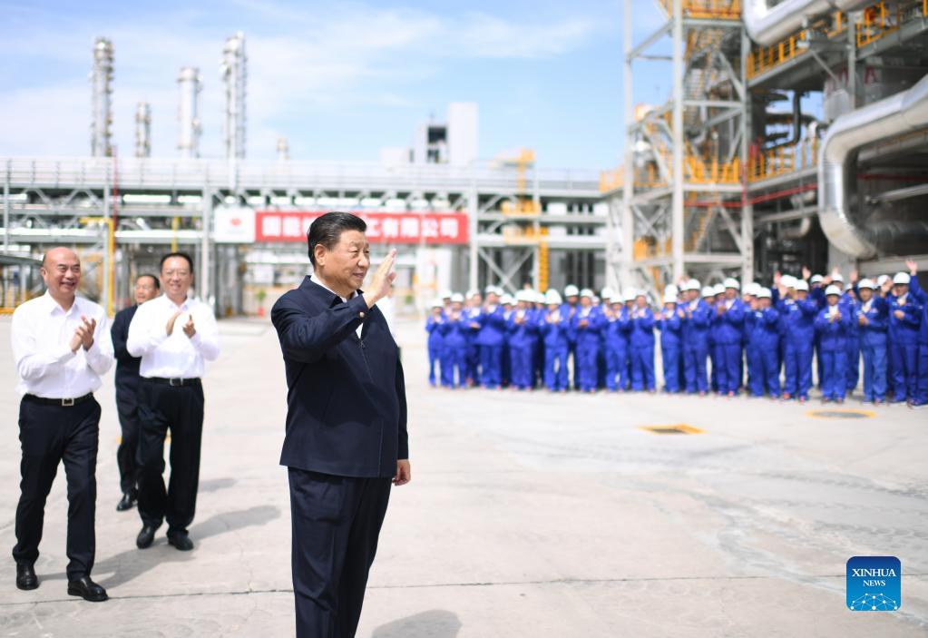 Chinese President Xi Jinping, also general secretary of the Communist Party of China Central Committee and chairman of the Central Military Commission, waves to the employees while visiting a chemical company during his inspection tour of Yulin City, northwest China's Shaanxi Province, Sept. 13, 2021. (Xinhua/Yan Yan)